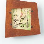 Grif was our best friend. He was fun and full of personality. He always had something to say. Many days he would hang out in the studio and watch me paint. He was a wonderful companion. When I first worked on the Petcasso sculptures for the Arizona Humane Society he wanted to be in the photo with all the other metal dogs. As a tribute to Grif, I have designed a series of paintings that are animal related. A paw print stamp finishes each piece and revenue from this art is donated to local animal charities.